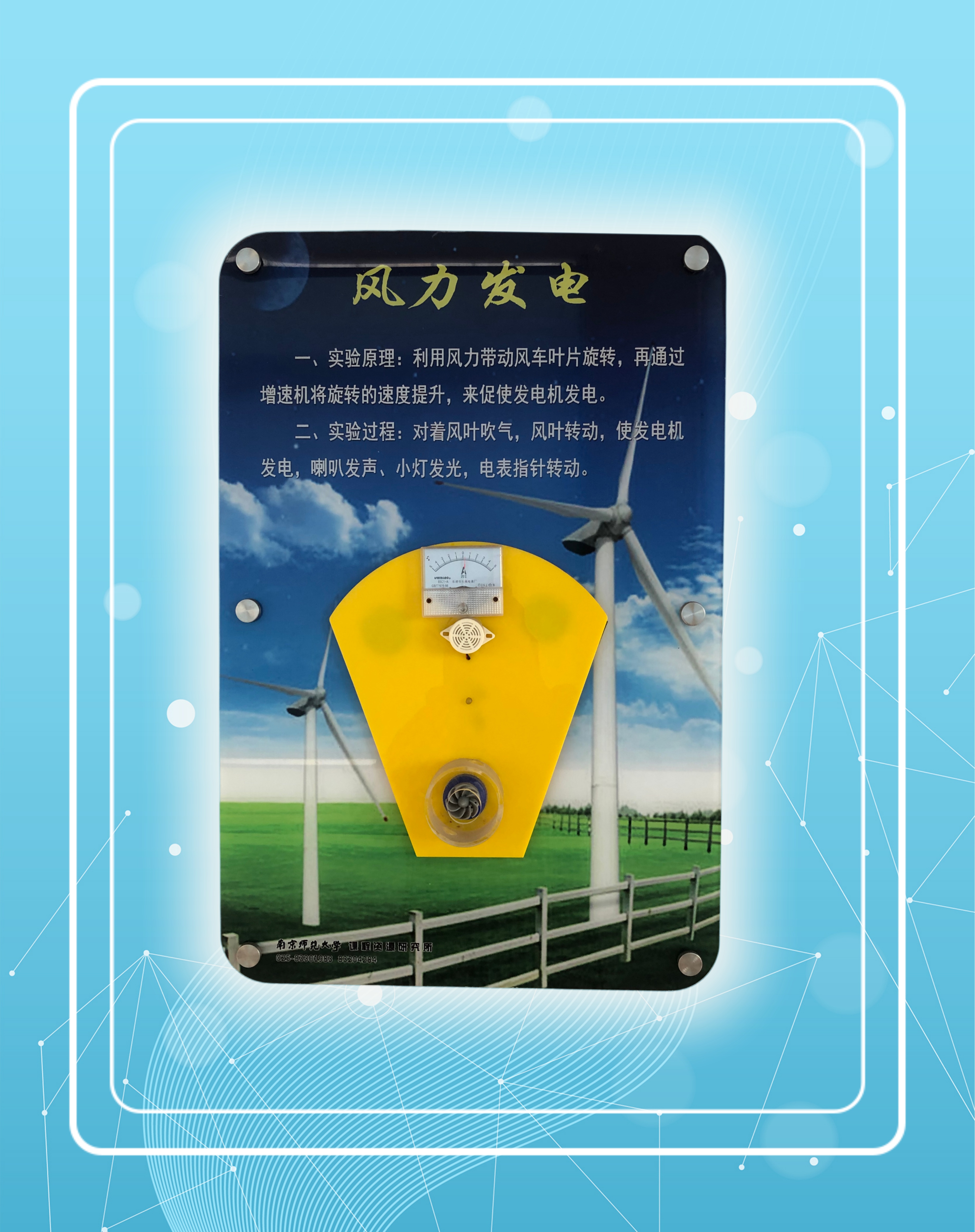 規格:400X600,主要展示器件安裝于亞克力前板上;前板為5mm厚亞克力板,畫面采用UV打印技術,背板采用12mm抗貝特板;前后板可用6顆36mm的工藝螺釘固定于墻體上。采用模塊化手搖發電機構和穩壓穩流技術供電。