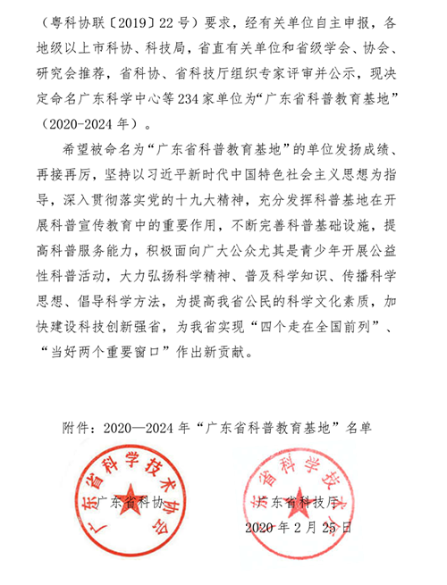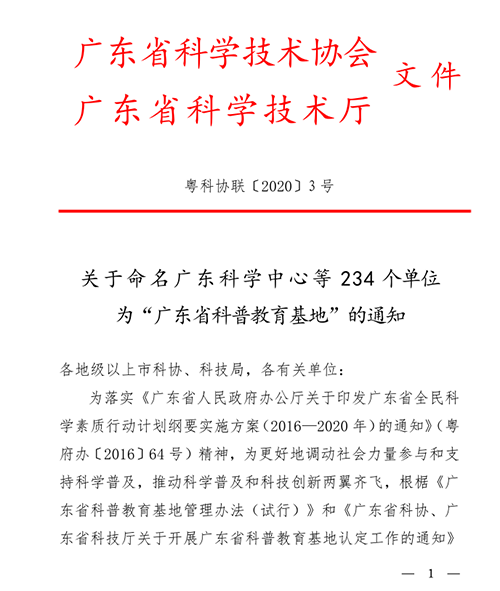 近日,廣東省科協(xié)、廣東省科技廳發(fā)布了《關(guān)于命名廣東科學(xué)中心等234個(gè)單位為“廣東省科普教育基地”的通知》,廣東廣視通科教設(shè)備有限公司被認(rèn)定為廣東省科普教育基地。