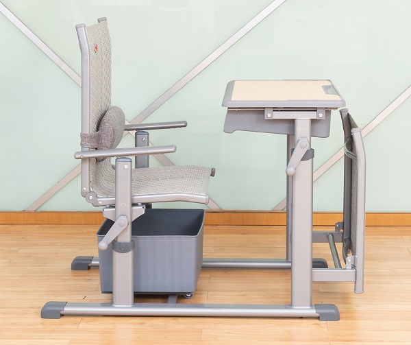 3、課斗規格:360mm*450mm*100mm±3mm,PP塑料一次成型,課斗可水平前后活動80mm,課桌底下前部設置藤質躺板。
