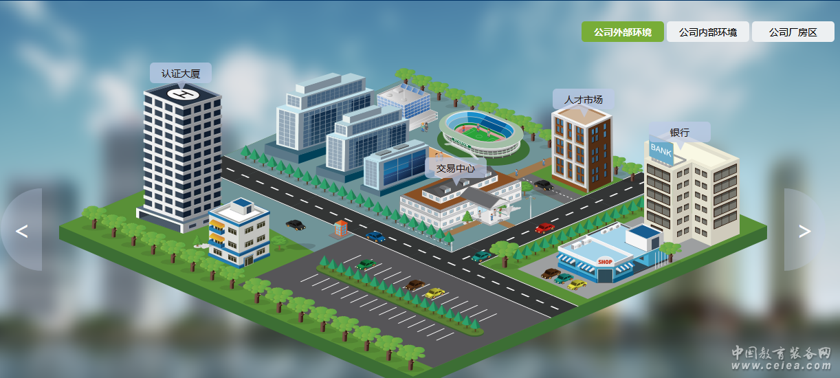 學生端分公司外部環境、公司內部環境和公司廠房區三個場景頁面展現,包括:公司大廈、市場部、銷售部、生產部、研發部、人力資源部、財務部及廠房和物品倉庫、人才市場、交易中心、認證大廈、銀行。