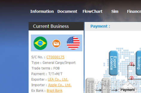 系統模擬了國際貿易主流業務流程 CIF + L/C、 CIF + D/A 、CIF + D/P 、CIF + T/T Before Shipment、CIF + T/T AfterShipment 、FOB + L/C、FOB + D/A、FOB + D/P、FOB + T/T)等.