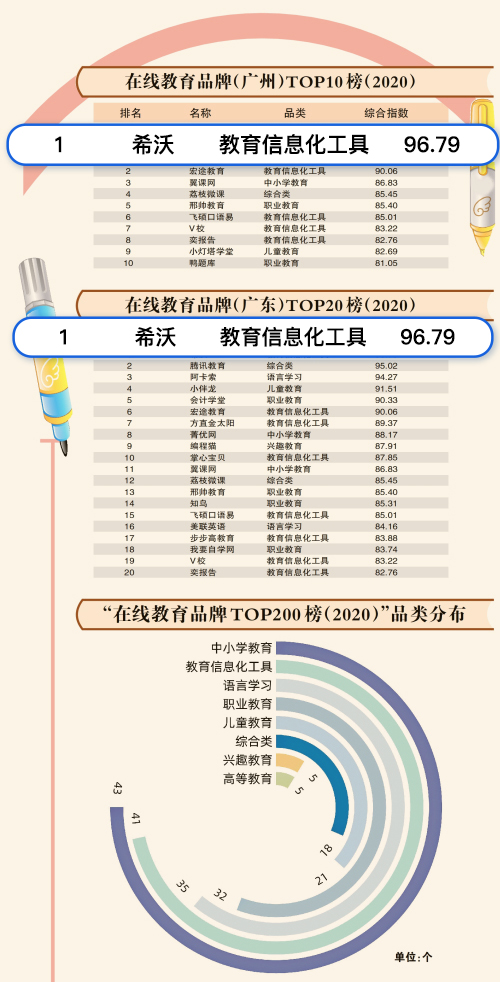 近日,廣州日報數據和數字化研究院(GDI智庫)發布了《在線教育品牌TOP200榜(2020)》(以下簡稱《榜單》)。《榜單》顯示,希沃憑過硬實力與優質服務分別斬獲2020“在線教育品牌榜教育信息化工具品類第一”、“在線教育品牌(廣東)榜第一”、在線教育品牌(廣州)榜第一”、“在線教育品牌榜第五”(多品類)*。