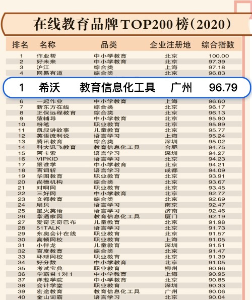 *資料引自廣州日報《GDI智庫發布<在線教育品牌TOP200榜單(2020)>在線教育10強扎堆北上廣》