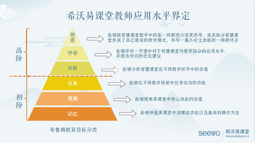 為了讓老師們在名師聯盟里,有更加明確的成長提升的目標和方向,結合經典的布魯姆認知認知目標分類模型,為名師聯盟的老師們量身定制了一套,專屬于名師聯盟的能力提升模型,幫助老師們基于希沃易課堂產品的基礎使用,到結合智慧課堂理論進行科學、合理、有知識體系地開展教研活動。