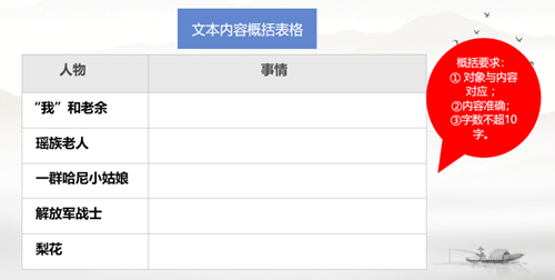 ①內(nèi)容梳理題,要求學(xué)生根據(jù)表格提示整體把握內(nèi)容;