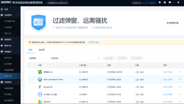 來自宜春市宜陽新區官園學校的涂老師表示:“集控平臺部署完畢后,已幫助實現廣告攔截、傳送文件、發送通知、設備開關機等系列操作,通過集控后臺可以查看每臺設備的運行情況,監測下課后設備有沒有關機,有助于校園節能。”