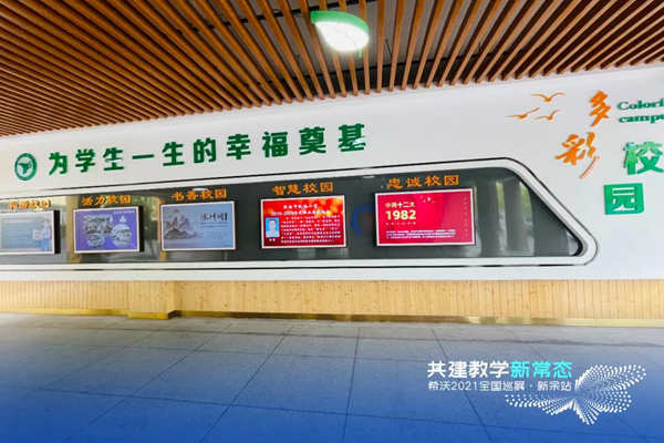 關于校園文化智慧化建設,學校領導表示:“云屏相對于傳統的宣傳方式,更方便快捷,有海量的圖片資源可供選擇,通過手機小程序就能隨時發布信息。后臺管理也十分方便,比如由電教負責智慧校園宣傳,教務負責書香校園宣傳,共同促進校園文化建設優質發展。在校門口,我校選擇了雙拼屏,具備克隆顯示、分屏顯示功能,在迎接檢查時,可將一塊展示歡迎詞,一塊顯示數據看板。”