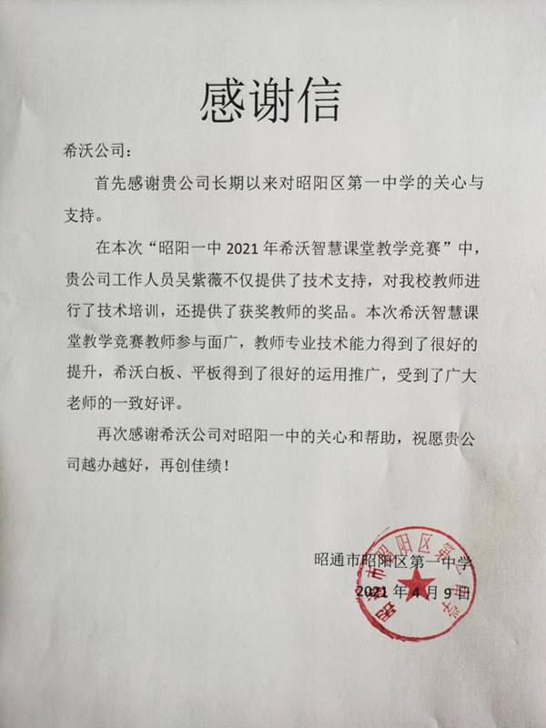 同時為感謝希沃的支持,林寧副校長特別給希沃寫了一封感謝信,感謝希沃一直以來對學(xué)校的支持,也希望未來雙方能合作得更好。