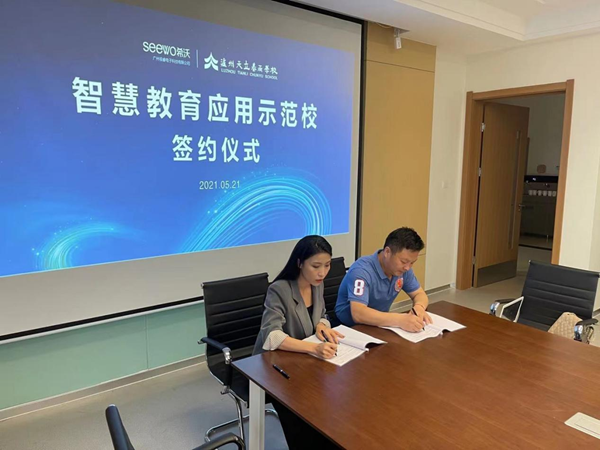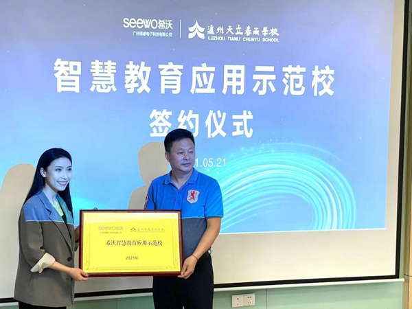 瀘州天立春雨學校楊兵校長同希沃學務事業(yè)部全國運營顧問馮智慧完成智慧教育應用示范校合作簽約。
