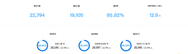 在骨干教師返校培訓之后,全市還開展了為期16天的線上訓練營,加強鞏固老師的教學應用技能。據(jù)悉,此次培訓采用線上培訓+線下實操的形式進行,此次培訓在線時間最長達17.2w小時,參與人數(shù)高達22794人,培訓通過率為95.82%。