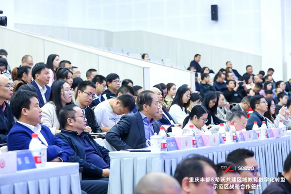 重慶市教育科學(xué)研究院黨委書記范卿澤,重慶市教育學(xué)會(huì)副會(huì)長、秘書長蘇飛躍,教育部教育信息化戰(zhàn)略研究基地專家組成員(華中師范大學(xué)人工智能教育學(xué)部副教授、博士生導(dǎo)師)陳敏,豐都縣人民政府黨組成員、副縣長王筱軍,豐都縣委教育工委書記、縣教委主任代海門,豐都縣中小學(xué)教師發(fā)展中心主任李應(yīng),廣州視睿電子科技有限公司(希沃)總裁周海生等嘉賓出席會(huì)議,豐都縣近600名干部教師參會(huì),共同開啟豐都縣教育數(shù)字化轉(zhuǎn)型的關(guān)鍵一步。