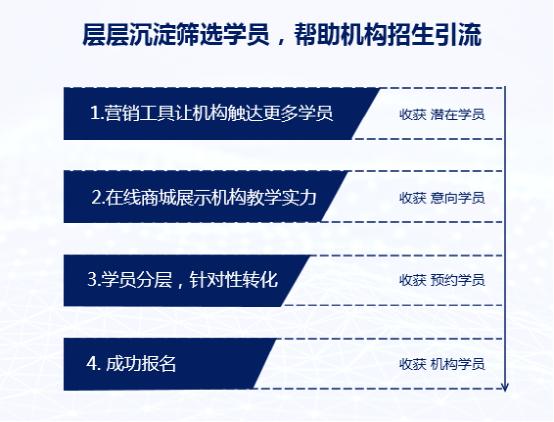 針對獲客、留存及轉化難題,信鴿機構版提供多種裂變營銷工具作為切入口,幫助機構獲取流量。同時,利用線上商城,打破區域限制,向潛在用戶展示機構實力及課程特色。招生管理系統系統根據用戶行為進行高價值潛客篩選,提高轉化效率。這些一系列舉措,讓流量“有跡可循”,更好地解決教培機構管理者的招生難題。