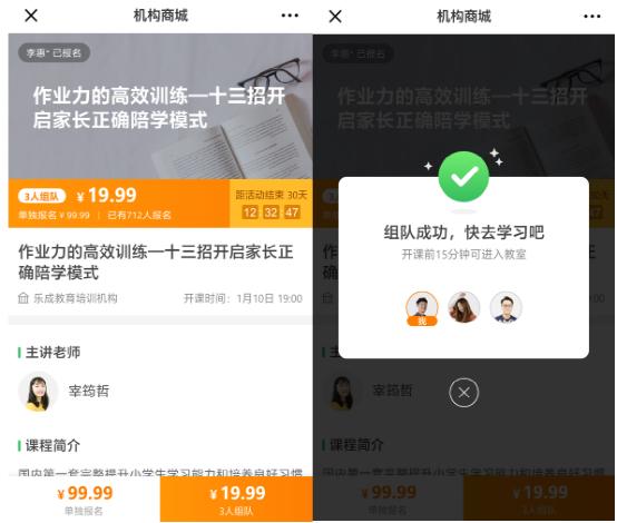教培機構的流量來源受制于管理者的人脈,信鴿機構版打造一系列營銷工具為管理者提供了更多選擇。如“組隊聽好課”功能,吸引潛在用戶帶動身邊的流量資源一起試聽,激活每一個用戶的私域流量池,很好地讓流量產生裂變效應。