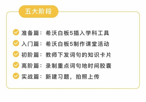 除了這些,老師實(shí)際遇到的難題可能還有很多。別擔(dān)心,今天就教各位老師利用希沃白板5的學(xué)科工具—單詞卡,結(jié)合希沃易課堂教師空間的資源推送,讓各位老師輕輕松松攻克以上難題。我們將按照以下五個(gè)階段,一步步解鎖新技能