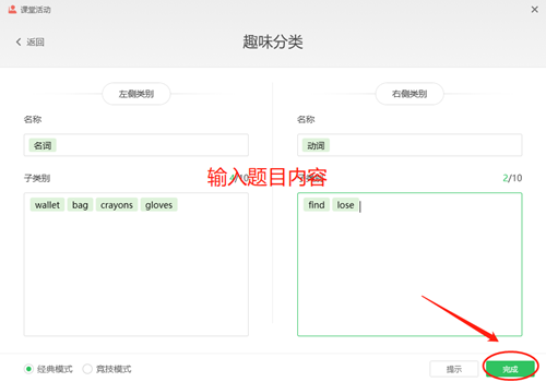 創(chuàng)設(shè)好的課堂活動(dòng)游戲,可以通過課件推送給學(xué)生,學(xué)生直接在課件上進(jìn)行操作,學(xué)習(xí)單詞之余利用課堂小游戲可以緩解學(xué)習(xí)的枯燥,還可以通過游戲進(jìn)一步認(rèn)識(shí)英語單詞。活動(dòng)形式多樣,有趣味分類、選詞填空、判斷對(duì)錯(cuò)等等,老師們可以嘗試一下。