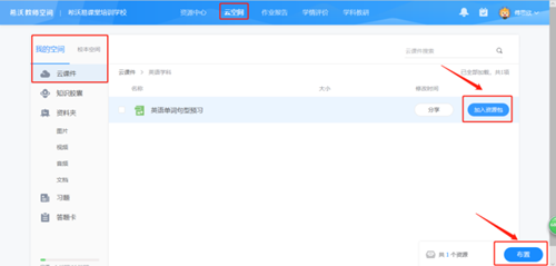 登錄希沃易課堂的教師空間:class.seewo.com;進(jìn)入云空間,找到剛剛制作好的英語單詞預(yù)習(xí)課件,加入資源包,并點(diǎn)擊布置。