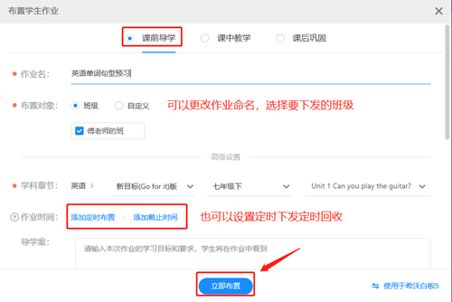 編輯好題目布置給學(xué)生即可,可以定時(shí)下發(fā)回收,提升學(xué)生的重視度。