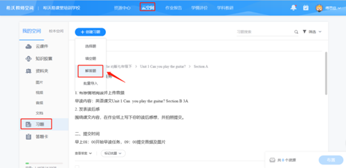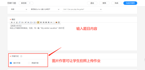 添加習(xí)題,可以從資源中心挑選習(xí)題,也可以自己上傳。當(dāng)然也非常推薦各位老師自己布置一道作文題目,讓學(xué)生在家中寫好一篇小作文,拍照上傳。小作文的形式可以更加全面地了解學(xué)生對(duì)單詞句型的運(yùn)用。