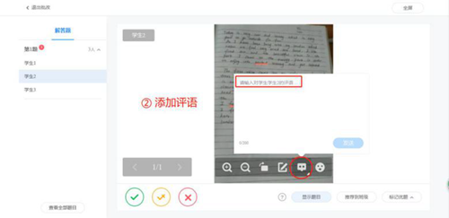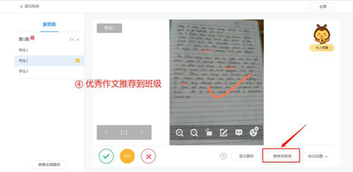 查看學(xué)生的作答,并進(jìn)行批改,可將優(yōu)秀答案推薦到班級(jí),讓學(xué)生之間互評(píng)互賞。