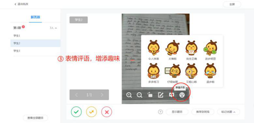 在批改作業(yè)時(shí),各位老師可以用畫筆進(jìn)行批注,就像平時(shí)批改作文一樣,新增加的表情評(píng)語—小蜜蜂貼紙,讓老師的評(píng)價(jià)變得更加活潑有趣,增加學(xué)生學(xué)習(xí)自信心。對(duì)于優(yōu)秀的答案,可以推薦到班級(jí),讓同學(xué)之間互賞互評(píng),激勵(lì)學(xué)生向優(yōu)秀的同學(xué)學(xué)習(xí)!