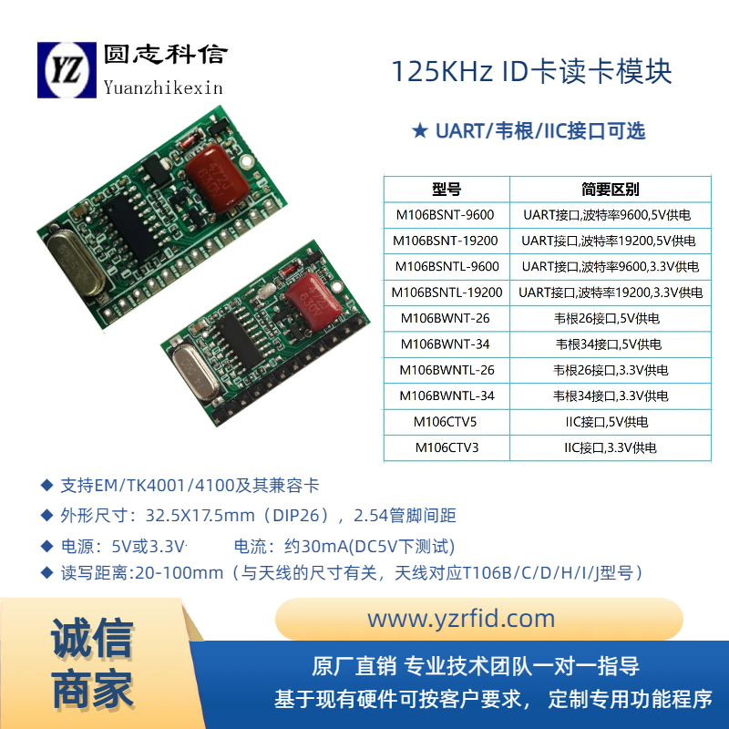 M106BXN新款非接觸ID卡射頻讀卡模塊采用125K射頻基站,為圓志公司新一代ID卡讀卡模塊