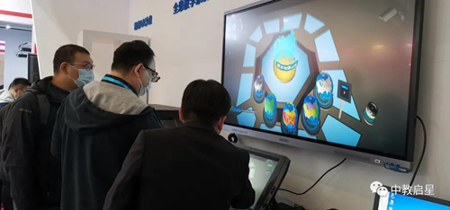中教啟星核心產品在1號館066號展臺實力吸睛,中行協金獎產品寰宇地理VR教學系統、文明的足跡VR教學系統,以及中行協推薦產品數字星球系統、交互教學系統、AR沙盤教學系統均吸引了不少觀眾停下腳步體驗。陜西省教育廳教育技術裝備管理中心主任趙夢也來到中教啟星展位體驗VR教學系統。
