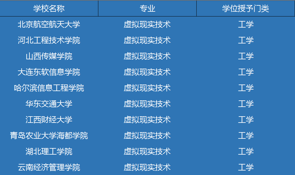 在公布的2020年度普通高等學校本科專業(yè)備案和審批結(jié)果中,有十所高校獲批開設“虛擬現(xiàn)實技術(shù)”專業(yè)。獲批“虛擬現(xiàn)實技術(shù)”本科專業(yè)院校名單如下: