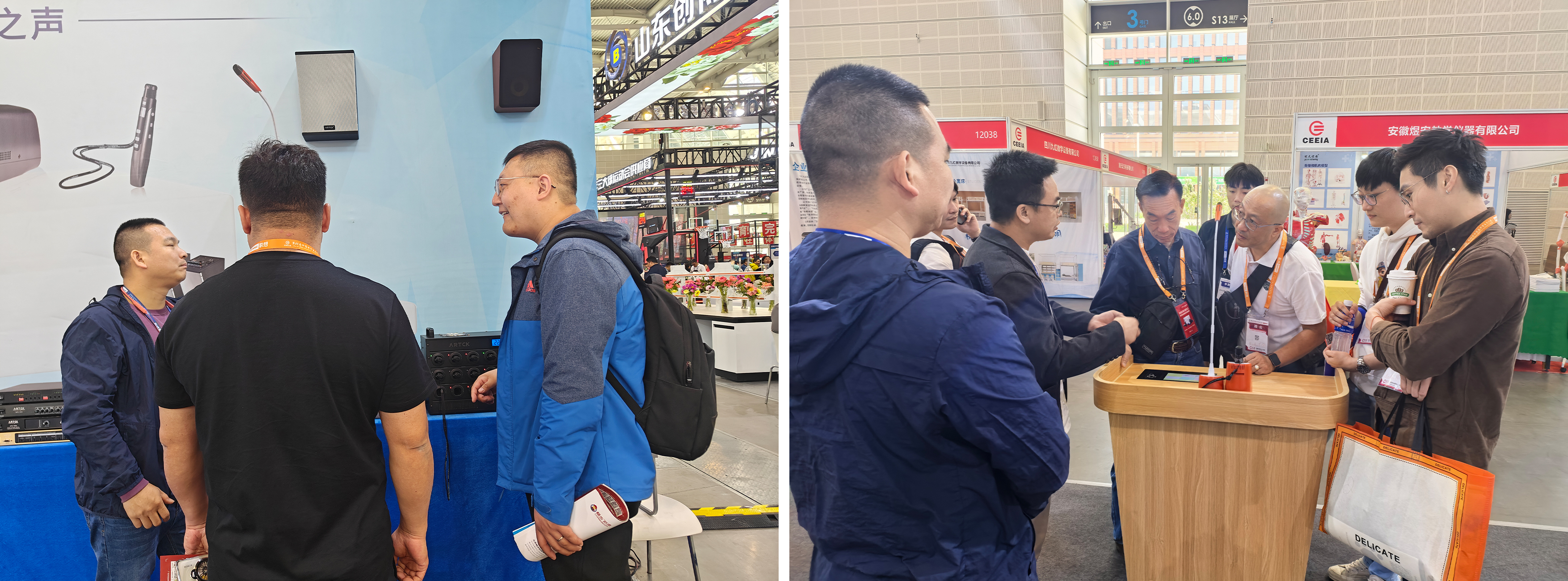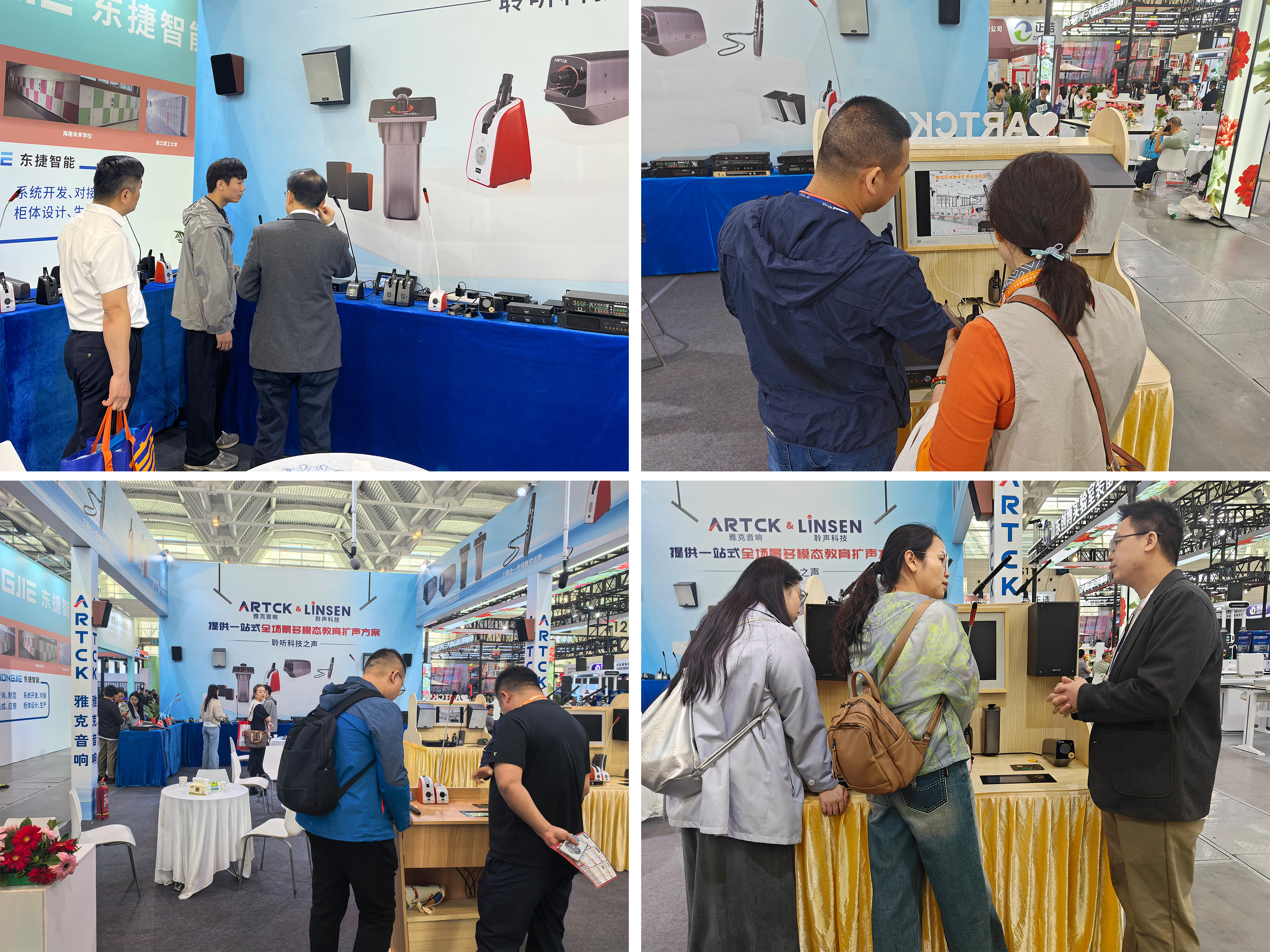 雅克音響全矩陣產品陣容一經亮相,通過沉浸式場景體驗,多維度展示雅克音響實力。開展不久,迅速吸引眾多觀展者的目光焦點,ARTCK多年技術沉淀在此刻煥發光彩。展位內人群絡繹不絕,從教育行業內人士到國際訪客均駐足體驗,接待長隊持續環繞展區。教育從業者、一線教師及采購團穿梭于雅克展示臺的模塊間,聆聽雅克技術團隊拆解產品邏輯、方案核心,觀摩實時場景動態演繹。
