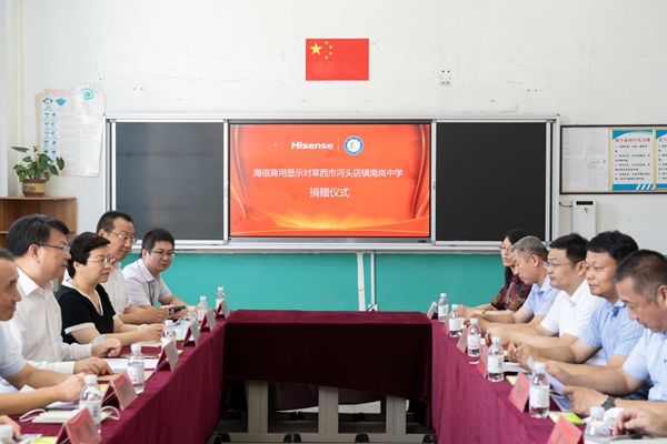 8月25日,海信商用顯示公司對青島萊西市河頭店鎮南嵐中學公益捐贈儀式在南嵐中學校內舉行。海信集團高級副總裁陳維強,海信視像科技副總裁、海信商用顯示公司總經理劉雪莉,青島市發改委相關領導,萊西市河頭店鎮相關領導和南嵐中學校領導等共同出席了本次儀式。