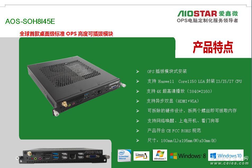 產(chǎn)品詳細介紹深圳市愛鑫微電子有限公司為更好的配合不同廠家的要求,可提供OPS主板與OPS準系統(tǒng)的方案配合各個廣告機,觸控一體機廠家,多媒體壁掛式教學一體機,數(shù)字標牌,錄播觸控一體機,同時保證所提供OPS主板與OPS插拔式電腦/OPS-C插拔式電腦主機是完全按照INTEL OPS規(guī)范定義的,完全支持鴻合教育一體機、東方中原教育一體機、創(chuàng)維教育一體機、康佳教育一體機、中銀液晶觸控一體機、中電數(shù)碼教育一體機、海爾觸控一體、TCL觸控一體機、KTC/HKC/HPC等各大交互式教育觸控一體機廠家,愛鑫微電子提供專業(yè)的定制化服務(wù)OEM/ODM. 聯(lián)系電話:18620397178 QQ:46078934 現(xiàn)階段我司已推出了一系列OPS電腦方案如下: 頂極OPS插拔式電腦方案:H110+6代CPU+2G獨立顯卡(GT730/GT850/GT950) 高端:H110+6代CPU (市場最新方案 4K極清方案)歡迎客戶取樣測試。支持4組USB3.0+3組USB2.0+3組異步顯示(VGA+HDMI+DP)+3組網(wǎng)口(可以直接接IP攝像機進行錄播與監(jiān)控或者網(wǎng)絡(luò)內(nèi)外網(wǎng)隔離進行封標) 中高端:H81+4代CPU/HM86+4-5代CPU(市場主流) 中端:H61+2-3代CPU/HM65+2-3代CPU(高性價比) 低端:baytrailJ1800/J1900無風扇低成本的OPS電腦(幼教觸控一體機專用) 深圳市愛鑫微電子有限公司(以下簡稱“AIOSTAR”)是一家集研發(fā)、生產(chǎn)和銷售于一體的高新技術(shù)企業(yè),同時是Intel、AMD、NVIDIA等芯片廠商緊密的合作伙伴。公司主營工業(yè)主板(ITX/3.5寸/NANO等)、媒體播放主機、OPS主機、OPS可插拔式電腦模塊、OPS主板、BOX-PC、網(wǎng)絡(luò)安全硬件平臺、服務(wù)器、工業(yè)平板電腦、一體化工作站等產(chǎn)品。目前,產(chǎn)品已廣泛應(yīng)用于DS、MIDS、IWB、POS、自助查詢、零售金融、工業(yè)自動化,智能交通,網(wǎng)絡(luò)信息安全,通訊、智能安防,云計算、石油石化、醫(yī)療、軍事裝備等多個領(lǐng)域。公司高度重視客戶的需求和滿意度,針對不同的客戶需求,能夠快速做出積極的響應(yīng),為其進行量身設(shè)計并提供個性化的OEM/ODM服務(wù)。 愛鑫微電子本著以“人才是企業(yè)的財富,效益是追求的目標,發(fā)展是永恒的主題”為宗旨;以“客戶至上,品質(zhì)為尊“為原則;提倡“博愛”“齊鑫”“微天下”的意愿,愿與全球各地的企業(yè)商家攜手合作,共謀發(fā)展!
