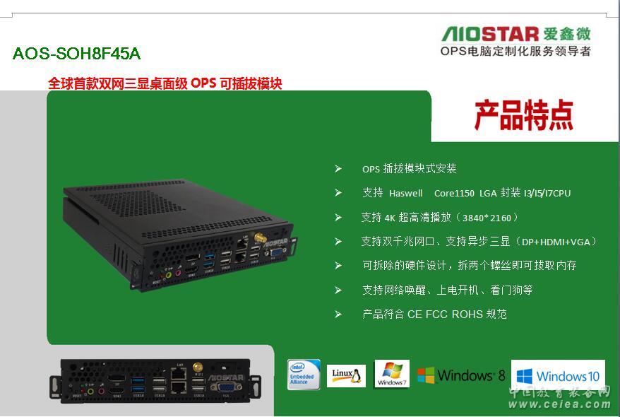 產品詳細介紹深圳市愛鑫微電子有限公司為更好的配合不同廠家的要求,可提供OPS主板與OPS準系統的方案配合各個廣告機,觸控一體機廠家,多媒體壁掛式教學一體機,數字標牌,錄播觸控一體機,同時保證所提供OPS主板與OPS插拔式電腦/OPS-C插拔式電腦主機是完全按照INTEL OPS規范定義的,完全支持鴻合教育一體機、東方中原教育一體機、創維教育一體機、康佳教育一體機、中銀液晶觸控一體機、中電數碼教育一體機、海爾觸控一體、TCL觸控一體機、KTC/HKC/HPC等各大交互式教育觸控一體機廠家,愛鑫微電子提供專業的定制化服務OEM/ODM. 聯系電話:18620397178 QQ:46078934 現階段我司已推出了一系列OPS電腦方案如下: 頂極OPS插拔式電腦方案:H110+6代CPU+2G獨立顯卡(GT730/GT850/GT950) 高端:H110+6代CPU (市場最新方案 4K極清方案)歡迎客戶取樣測試。支持4組USB3.0+3組USB2.0+3組異步顯示(VGA+HDMI+DP)+3組網口(可以直接接IP攝像機進行錄播與監控或者網絡內外網隔離進行封標) 中高端:H81+4代CPU/HM86+4-5代CPU(市場主流) 中端:H61+2-3代CPU/HM65+2-3代CPU(高性價比) 低端:baytrailJ1800/J1900無風扇低成本的OPS電腦(幼教觸控一體機專用) 深圳市愛鑫微電子有限公司(以下簡稱“AIOSTAR”)是一家集研發、生產和銷售于一體的高新技術企業,同時是Intel、AMD、NVIDIA等芯片廠商緊密的合作伙伴。公司主營工業主板(ITX/3.5寸/NANO等)、媒體播放主機、OPS主機、OPS可插拔式電腦模塊、OPS主板、BOX-PC、網絡安全硬件平臺、服務器、工業平板電腦、一體化工作站等產品。目前,產品已廣泛應用于DS、MIDS、IWB、POS、自助查詢、零售金融、工業自動化,智能交通,網絡信息安全,通訊、智能安防,云計算、石油石化、醫療、軍事裝備等多個領域。公司高度重視客戶的需求和滿意度,針對不同的客戶需求,能夠快速做出積極的響應,為其進行量身設計并提供個性化的OEM/ODM服務。 愛鑫微電子本著以“人才是企業的財富,效益是追求的目標,發展是永恒的主題”為宗旨;以“客戶至上,品質為尊“為原則;提倡“博愛”“齊鑫”“微天下”的意愿,愿與全球各地的企業商家攜手合作,共謀發展! 規格參數 處理器 CPU Intel英特爾 Core酷睿 i5-4460 (3.2GHz/6MB/HD4600/22nm/84W/LGA1150) 芯片組 Intel® H81/B85 BIOS AMI 32Mbit,支持無盤啟動、網絡喚醒、上電開機、看門狗等功能 內存 容量 4GB SO-DIMM DDR3L 1600 MHz memory , Max.8GB 存儲 SATA接口 MINI PCIE 2.5〞5400rpm 500G 1xMini PCIE 顯示 芯片組 輸出
