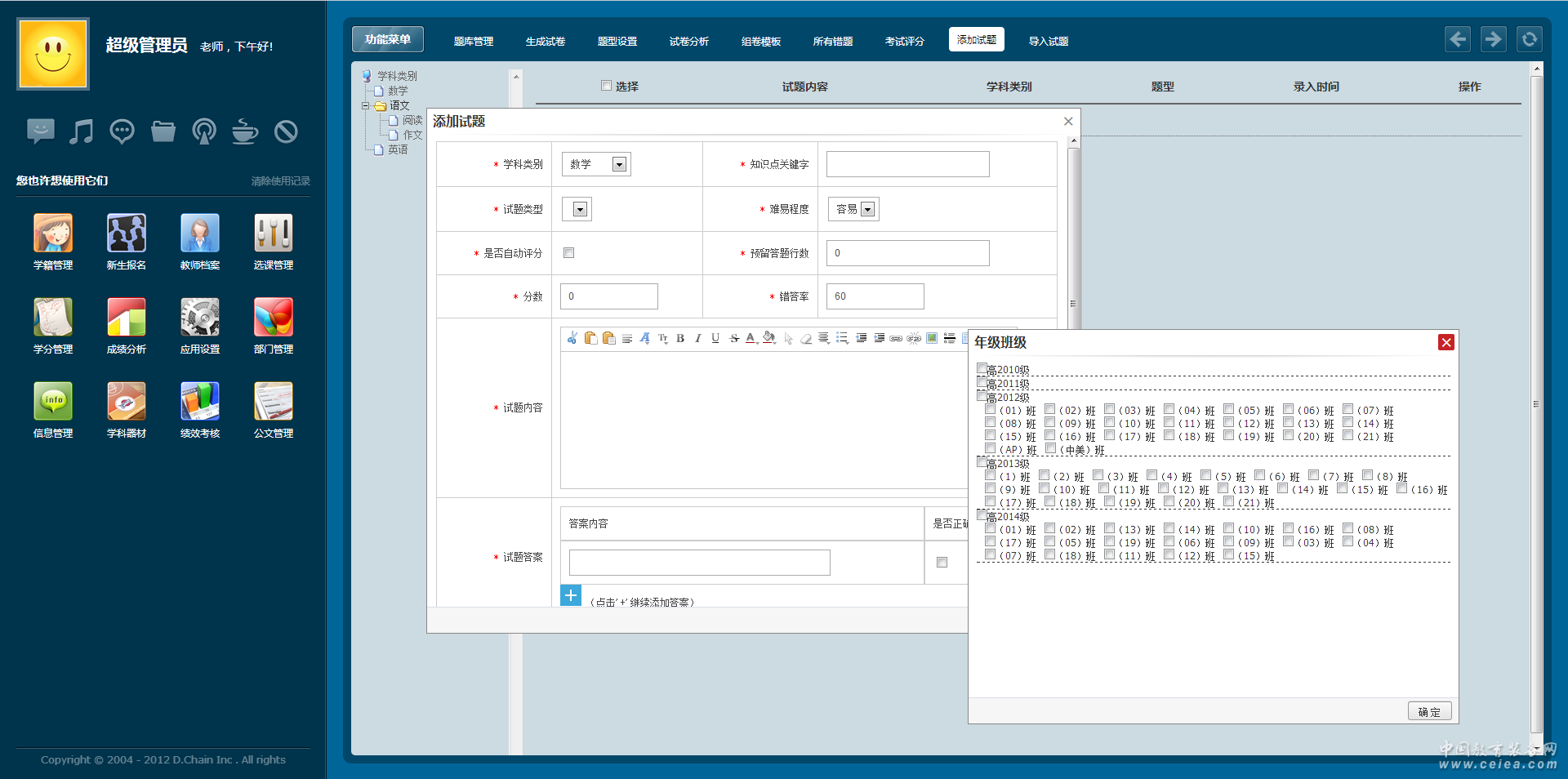題庫管理 靈活設置試題科目類別、題型自定義設置(包含別名設置)、試題添加、試題批量導入,管理考試的所有試題信息,同時包含了對試題新增、試題批量導入、試題編輯、試題刪除,同時針對試題的內容包含對題型設置,考試試題設置、試題解析、分數、錯答率、試題的難易程度等設置。 組卷管理 組卷模板設置(主要是生成一個試卷的主框架,針對試卷包含大題及每個大題包含的小題以及針對小題的難易程度數量的設置,該功能用于在試卷組卷中使用)、生成試卷(針對試卷的生成包含了兩種操作方式,第一種為試卷導入,在導入的過程中提供試卷導入模板及試卷模板數據,第二種是采用自動組卷的方式,調用組卷模板的形式從題庫中或錯題庫選擇試題,并生成試卷,以上兩種方式都包含考試開始時間、考試結束時間、試卷的名稱、分數限制、參加考試人群設置以及試題所屬的知識分類的選擇)。 考試設置 包含考試開始、結束時間設置、考試名稱設置、考試說明設置、試卷使用范圍設置、考試總分設置。 在線考試 參加考試人員在線做題,在考試試卷提交后可查看每個試題的解析信息,同時查看個人的考試分數及排名信息。 考試評分 針對某項試卷進行考試成績評分,顯示當前考試人員成績信息,并且成績排名的統計列表支持Excel報表的導出。 教師錯題庫 根據試題難度設置錯答率,在考試過程中,當該試題錯誤數滿足錯答率條件后自動進入教師錯題庫,同時生成該試卷錯題報表,可以在線打印。 學生錯題庫 考試完成后學生根據自己未掌握的知識點相關試題添加到自己的錯題庫,包含學生對錯題庫的管理,如移除錯題。 成績報表 考試評分完成以后生成該試卷的分數名次、各個班級的平均分、前多少名的平均分報表。 試卷分析 當前考試試卷中每道題的正確人數以及錯誤人數的統計,以及該道題所對應的知識點,可以自定義設置條件導出當前試卷的分析報表,同時查看當前試卷的錯題庫以及每個參考人員的錯題庫信息。 |