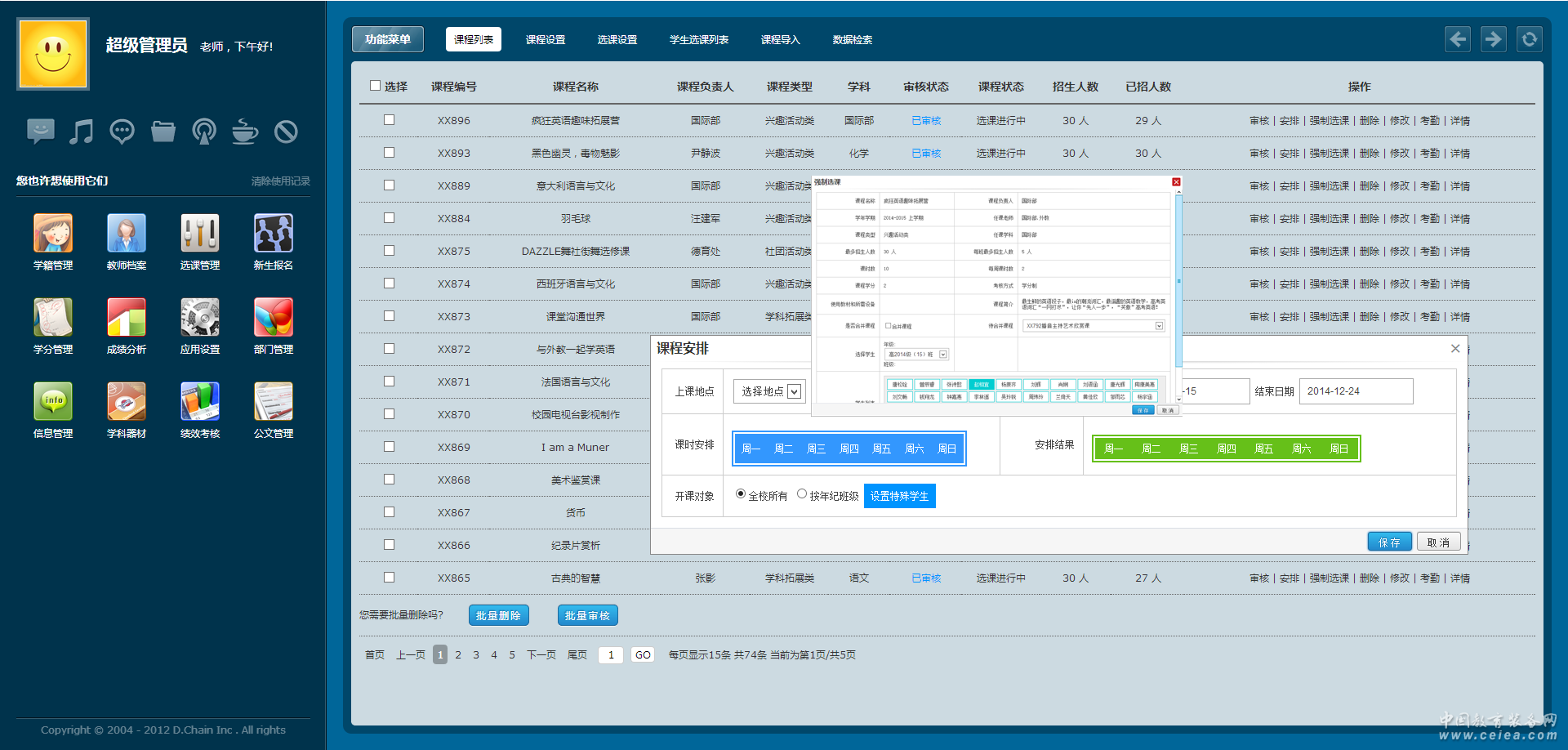 課程名稱設置、任課教師設置、教學班名稱、選課的開始與結束時間、最大招生人數、最小開班人數、每班最多招生人數、課時數、學分、考核方式、課程類型等自定義設置,并且支持批量導入。