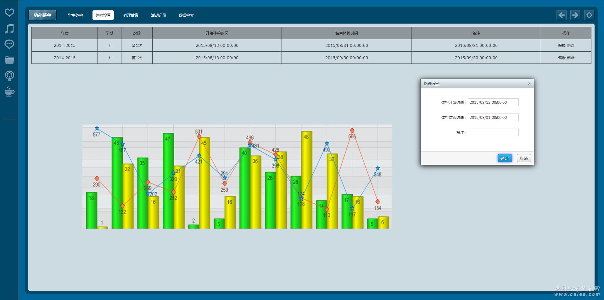 包含體檢項目的設置(年度學期、體檢開始時間、體檢結束時間、備注),學生體檢信息錄入,采用自動關聯(lián)學生的方式針對學生牙齒、血壓等進行學生的體檢登記。
