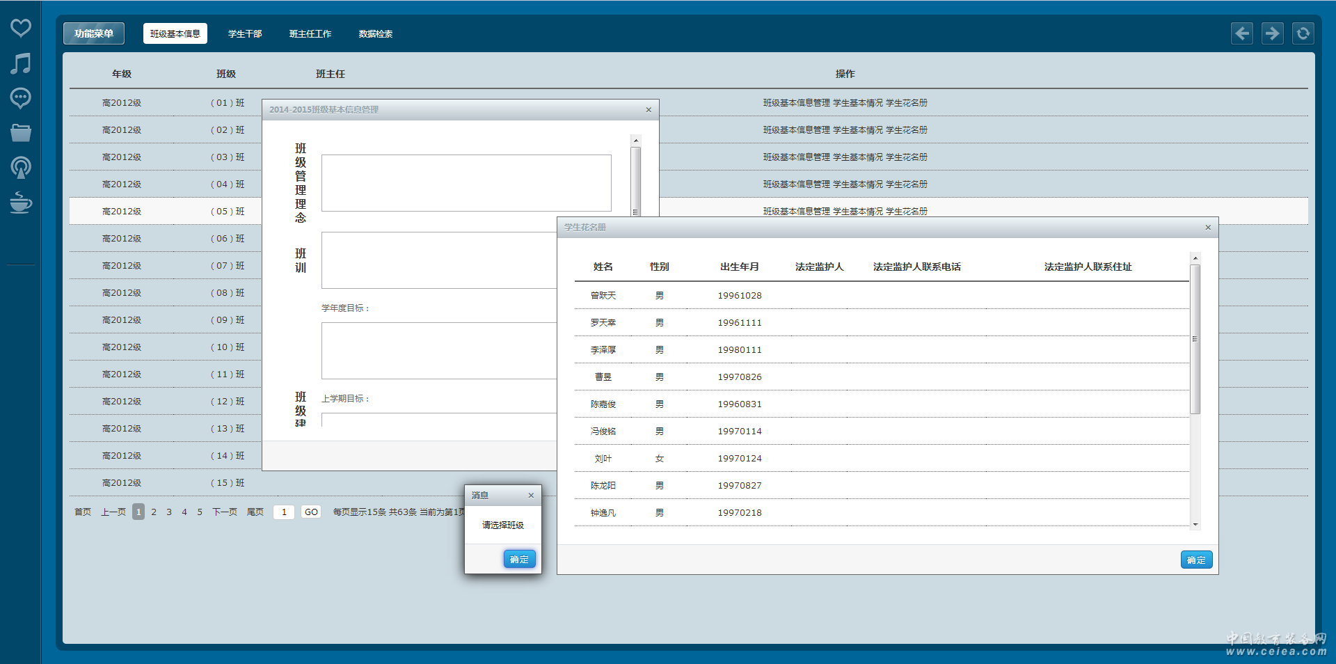 主要包含每個年度學期對各個班級基礎信息(班級基本信息、學生花名冊、班主任工作)、學生干部、班主任工作進行查看匯總,并生成統計報表。