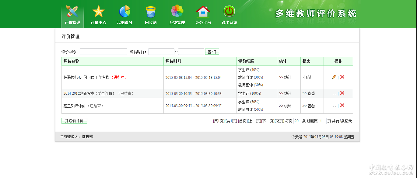 產品詳細介紹教師專業發展性評價系統是一套為提高教師的教學質量,反饋學生的心聲,提高學校教務管理能力的系統。針對各專業所授課程及教師的評價結果,直觀的統計出每位教師的綜合能力。其中包含領導評、專家評、教師互評、學生評、家長評五維一體的評價系統,并支持去掉最高比例與最低比例值后的最終數據,真正做到公平、公正、公開。