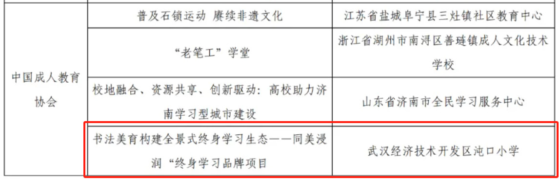 近日,經過各省積極推薦和全國評選,備受矚目的2025年全國新時代“終身學習品牌項目”推介名單正式公布。華文眾合優(yōu)秀案例校武漢經開區(qū)沌口小學打造的“同美浸潤”書法美育項目,以構建全景式終身學習生態(tài)為特色,在湖北省14個參評項目中脫穎而出,成功入選2025年全國新時代“終身學習品牌項目”,成為全省6個獲此殊榮的唯一一所小學。