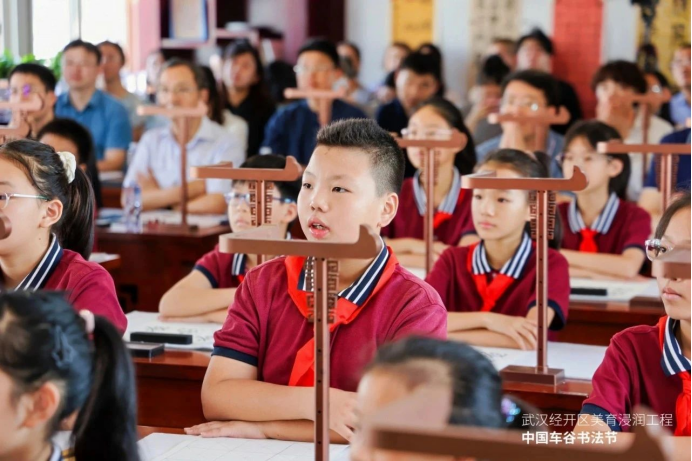 沌口小學負責人介紹,“同美浸潤”項目秉承“以書育美,以美立人”理念,以“同美術館”為展覽平臺,以“共同”美育為實踐路徑,以“同創(chuàng)未來”為發(fā)展實現美好愿景,形成了“傳統(tǒng)與創(chuàng)新融合、課內與課外聯動、學校與社會共育”的書法美育生態(tài)。首創(chuàng)的“1341”浸潤模式以校內專業(yè)美術館“同美術館”為核心平臺,聚合學校、家庭、社區(qū)三方力量,通過館校共建、跨界融合、數智賦能、全球對話四大路徑,打造覆蓋全齡段、全場景的書法美育終身學習體系,讓傳統(tǒng)文化在新時代煥發(fā)活力。