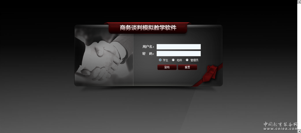 國際商務(wù)談判模擬教學(xué)軟件介紹 商務(wù)談判(Business Negotiations),是買賣雙方為了促成交易而進(jìn)行的活動,或是為了解決買賣雙方的爭端,并取得各自的經(jīng)濟(jì)利益的一種方法和手段。在《商務(wù)談判》課程的學(xué)習(xí)過程中,學(xué)生很難得到身臨其境的體驗(yàn),不能很好的達(dá)到教學(xué)的效果。 《商務(wù)談判模擬教學(xué)軟件》很好的解決了商務(wù)談判課程中實(shí)習(xí)和實(shí)訓(xùn)的問題,利用計(jì)算機(jī)進(jìn)行商務(wù)談判知識的學(xué)習(xí),同學(xué)之間模擬商務(wù)談判的整個(gè)流程,增加課程的趣味性,掌握商務(wù)談判的技巧和實(shí)際的業(yè)務(wù)能力,培養(yǎng)談判場合下人際交流互動技巧以及有效溝通的能力素質(zhì)。 《商務(wù)談判模擬教學(xué)軟件》定位于實(shí)戰(zhàn)訓(xùn)練性質(zhì)的談判教學(xué)軟件,可供經(jīng)濟(jì)管理類專業(yè)學(xué)生的課程實(shí)訓(xùn)使用。軟件幫助學(xué)生學(xué)習(xí)談判的相關(guān)知識,提高對談判活動的認(rèn)識,了解各類型談判的流程規(guī)范,靈活實(shí)踐談判技巧、掌握談判溝通能力、熟識談判禮儀禮節(jié),認(rèn)識商務(wù)函電談判的方式。
