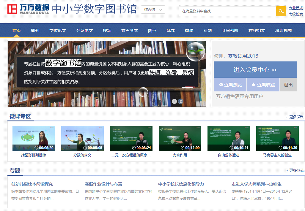 萬(wàn)方數(shù)據(jù)中小學(xué)數(shù)字圖書(shū)館是一款專門針對(duì)中小學(xué)教學(xué)應(yīng)用的數(shù)字圖書(shū)館產(chǎn)品,旨在為全國(guó)中小學(xué)教師、教研人員和學(xué)生提供“一站式”教育教學(xué)資源服務(wù)。萬(wàn)方數(shù)據(jù)中小學(xué)數(shù)字圖書(shū)館利用知識(shí)鏈接技術(shù),實(shí)現(xiàn)了期刊、學(xué)位論文、會(huì)議論文、視頻、有聲繪本、試卷、微課等異構(gòu)資源的知識(shí)組織,將現(xiàn)代教育理念與高品質(zhì)基礎(chǔ)教育資源有機(jī)融合,有效推動(dòng)中小學(xué)教育用戶素質(zhì)和能力的提升。