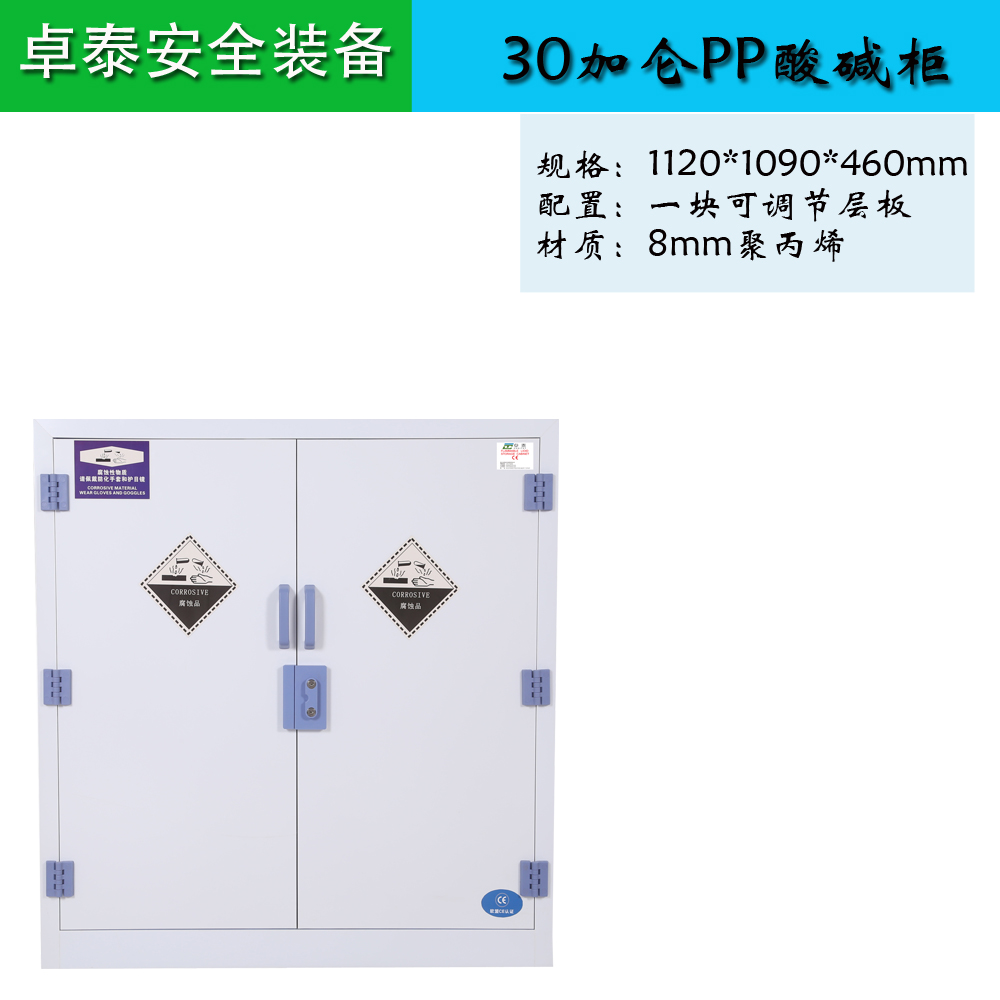 產品詳細介紹宿遷卓泰安全裝備銷售熱線: 銷售部:陳先生13851372037 業務部郵箱:choitay@163.com 官方網站:www.choitay.com PP酸堿柜具有耐強酸、強堿與抗腐蝕的特性。適用于實驗室各類工具的洗滌對帶有化學特性的試劑瓶或其他物品進行清洗。 產品特色: 1.具有耐強酸、強堿與抗腐蝕的特性。 2.降低環境污染,維護使用者的健康。 制作工藝: 1,柜體采用一體成型、無縫焊技術,極大的加強了柜體的結構性,有效的降低了柜體因熱脹冷縮而引起的變形。 2,層板:采用8mm厚瓷白色優質原料PP板制作,四邊做突起設計 防止濺漏;底部用立式加固條整體焊成型,保證其受重不會變形。 層板為活動式,可隨意抽取 。 3,頂部預留90或者110mm排風口(可選) 4,警示標簽:柜門開口貼有警示標簽,提醒周圍人群注意安全, 材質規格: 1.本體:采用抗強酸堿耐化學藥品,耐沖擊磁白色PP板承制,具有永久性,厚度8mm,抗強酸、化學藥品,耐沖擊,不腐蝕,不生銹。 2.鉸鏈/把手:采用耐強酸、強堿材質,拉門采用同質PP聚丙稀材料制作。 非標規格,可依照客戶需求定制。 型號 外形尺寸(cm) 附 注 選配 高×寬×深 ZT4P 56×43×43 PP8mm板材、單門、一塊隔板、PP雙鎖扣 PP雙暗鎖 ZT12P 89×59×46 PP8mm板材、單門、一塊隔板、PP雙鎖扣 ZT22P 165x60x46 PP8mm板材、單門、兩塊隔板、PP雙鎖扣 ZT30P 112×109×46 PP8mm板材、雙門、一塊隔板、PP雙鎖扣 ZT45P 165×109×46 PP8mm板材、雙門、兩塊隔板、PP雙鎖扣 ZT60P 165*86*86 PP8mm板材、雙門、兩塊隔板、PP雙鎖扣 ZT90P 165*109*86 PP8mm板材、雙門、兩塊隔板、PP雙鎖扣