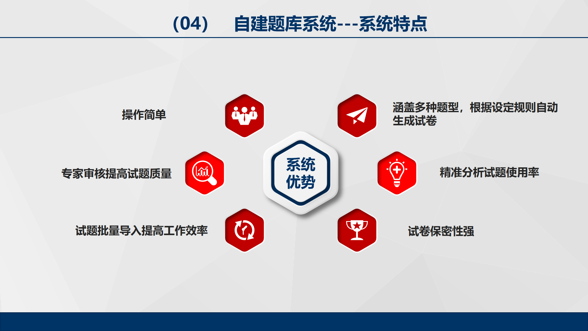 產(chǎn)品詳細(xì)介紹自建題庫管理系統(tǒng),系統(tǒng)實(shí)現(xiàn)了教考分離,操作簡單、涵蓋多種題型,根據(jù)設(shè)定規(guī)則自動(dòng)生成試卷、專家審核提高試題質(zhì)量、精準(zhǔn)分析試題使用率、試題批量導(dǎo)入提高工作效率、試卷保密性強(qiáng)。