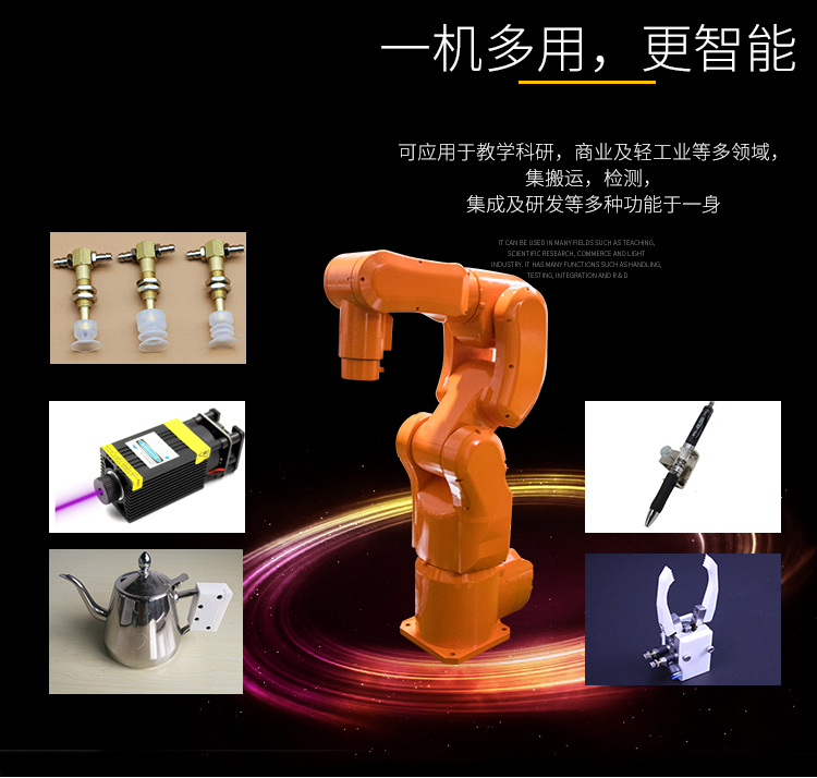 產品詳細介紹輕量化、微型化、功能全;是濃縮了企業一線制造車間用的工業機 器人所有的基本功能,真實的機器人控制系統,與 ABB/安川等品牌機器人編程語言規 則相似,提高學生編程能力。可搭配舞獅服飾或寫字夾具、吸盤,用于娛樂或觀賞應用 編程學習和機器人寫字或搬運碼垛編程應用。六自由度機器人是一款針對高校教學應 用開發的六軸機器人。機器人結構緊湊、體積小、重量輕、其最大負載 5KG,臂展活動 范圍540mm。腕部采用中空結構,走線更方便、動作更靈活