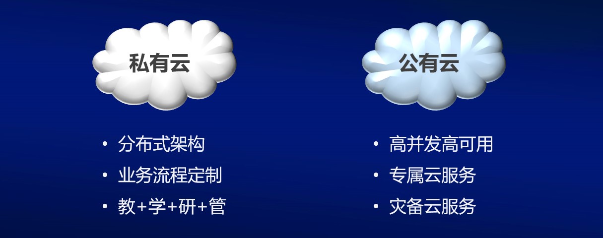 在大空間的架構里,中慶所有的服務都基于云實現,通過云打破了傳統空間的距離。中慶可以為用戶提供專屬化定制的私有云和公有云部署:私有云定位于教學流程的專項打造,公有云則為高并發、高可靠、高性能的應用提供支持,例如點播、直播、互動等。