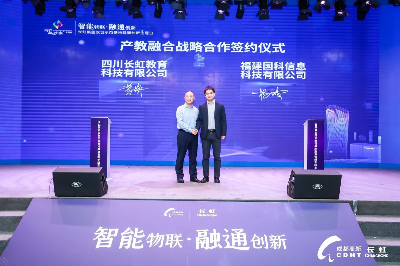 主論壇現(xiàn)場(chǎng),舉行了一系列融通“結(jié)對(duì)”儀式,展示最近融通發(fā)展的系列成果。其中四川長虹教育科技有限公司與福建國科信息科技有限公司,進(jìn)行了產(chǎn)教融合戰(zhàn)略合作簽約儀式,長虹教育公司總經(jīng)理黃煥與國科科技副總經(jīng)理?xiàng)畈ù黼p方進(jìn)行簽約。