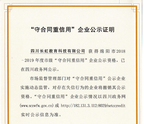 近日,從綿陽(yáng)市市場(chǎng)監(jiān)督管理局獲悉,四川長(zhǎng)虹教育科技有限公司獲得2018-2019年度市級(jí)“守合同重信用”企業(yè)稱(chēng)號(hào)。