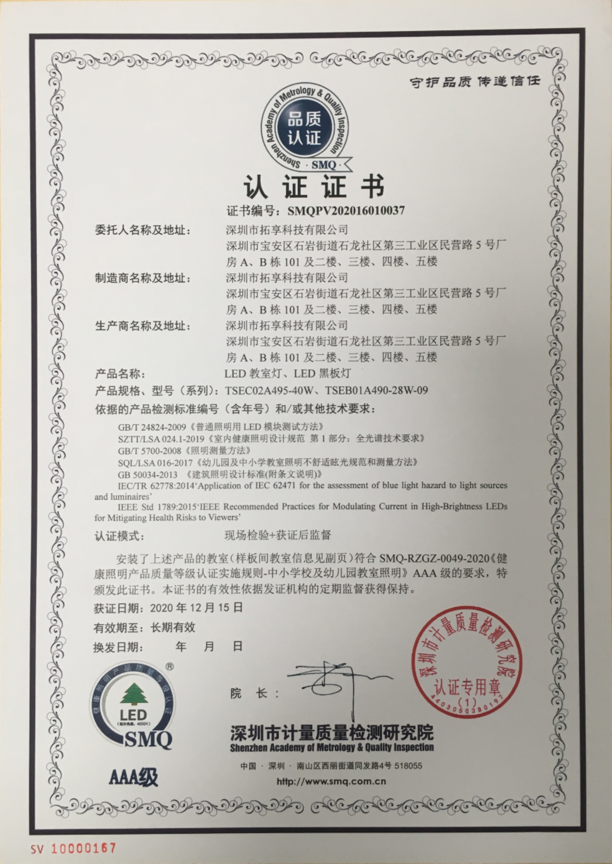 2020年10月,針對深圳市最新出臺的全光譜教室照明標準,雷曼拓享配合深圳市計量院,選用最新研創的“全光譜護眼教室燈+全光譜護眼黑板燈”,在深圳市寶安孝德學校搭建的樣板間,成為市面上首個符合標準的AAA級示范樣板。