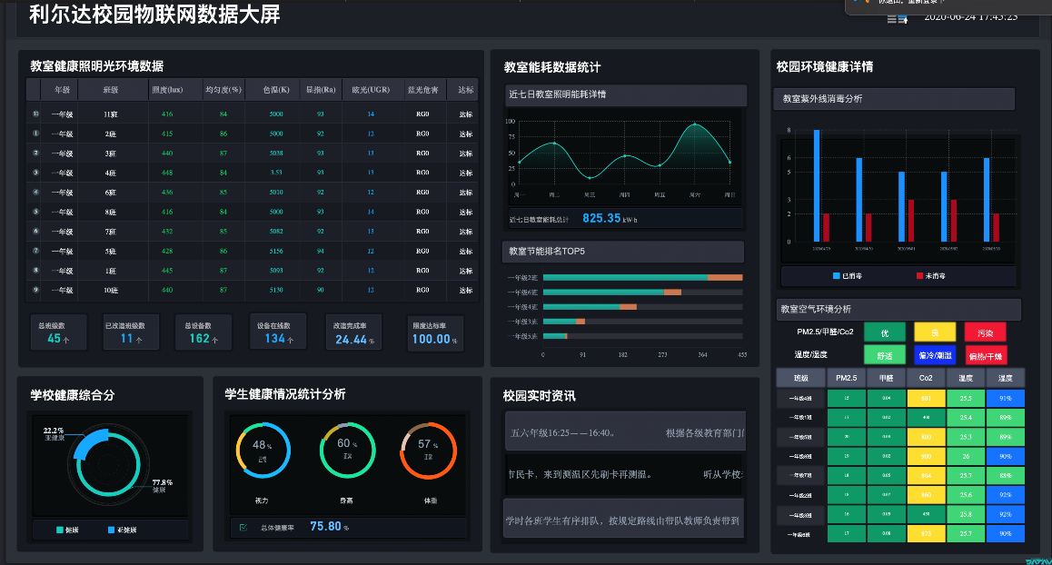 在此基礎(chǔ)上,利爾達(dá)發(fā)揮其多年來從事物聯(lián)網(wǎng)產(chǎn)品研發(fā)的技術(shù)優(yōu)勢,在不增加布線的情況下,輕松實現(xiàn)教室內(nèi)的場景智能化,上課、自習(xí)、投影、晴天、陰雨天、夜間等不同場景對應(yīng)不同的光環(huán)境。通過教室內(nèi)的傳感器和智能化系統(tǒng),實現(xiàn)了教室內(nèi)的光照度隨著室外環(huán)境的變化而相應(yīng)的變化,始終保持課桌面具有較好的健康照度,學(xué)生長時間在這樣的光環(huán)境中學(xué)習(xí),眼睛更為舒適。教室內(nèi)可通過傳感器監(jiān)測室內(nèi)的溫濕度、甲醛、PM2.5、二氧化碳濃度等數(shù)據(jù),并與教室內(nèi)其他設(shè)備形成聯(lián)動。比如上課時如果二氧化碳濃度過高,此時學(xué)生在這樣的環(huán)境下上課,容易犯困,當(dāng)系統(tǒng)檢測濃度過高時,會自動開啟新風(fēng)系統(tǒng),沒有新風(fēng)系統(tǒng)的教室會給上課老師一個提醒——開啟窗戶通風(fēng),從而使學(xué)生保持精神飽滿狀態(tài)和保持良好坐姿,提高學(xué)習(xí)效率同時有效的防控近視。