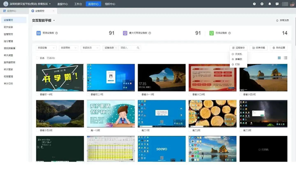 該學校擁有3個校區、100余間多媒體教室,教室內多媒體教學設備一旦出現異常,電教管理老師要到教室才能解決,后期設備維護壓力大。接入希沃魔方·數字基座后,老師通過設備管理應用,遠程就可以操作一鍵關機、一鍵鎖屏等指令;針對要統一安裝的文件,也無需到教室中逐一安裝,系統支持一鍵靜默安裝,既不影響正常上課秩序,又能提升設維效率。