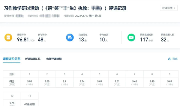 以聽課評課為例,南校區的老師在希沃魔方上發起聽課評課,兩個校區的老師可通過二維碼或鏈接進入群內,在線觀看公開課,在課后還能通過科學的評分表進行反饋。目前,惠州市第十一小學累計產生線上化教研交流研討近800次。